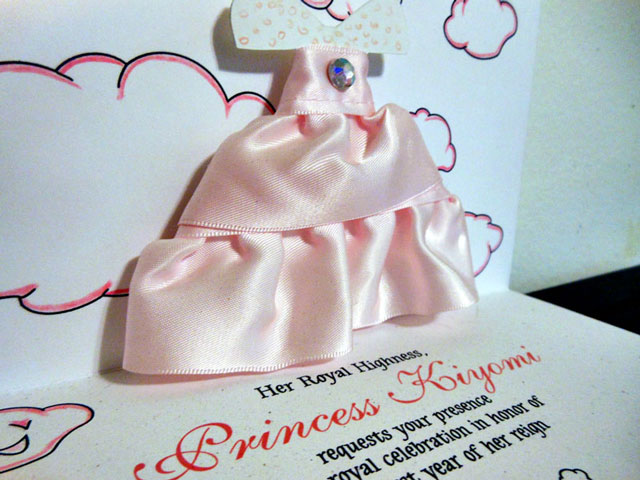 She wanted a “Baby Princess” theme, which was to represent her baby’s personality. So, I chose to create a ruffled dress, complete with a sash and rhinestone that would pop up when opened. Also to keep the fairy tale flowing, I added fluffy clouds in the background then accented them with pink colored pencil, which also matched “Princess Kiyomi.” To complete the design, I added Manga style “baby royalty” clouds to tie in the Japanese essence that was also within little Kiyomi’s ethnicity.